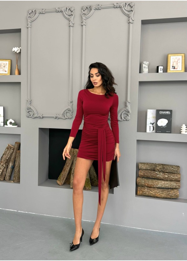 BELİ KUŞAKLI MİNİ ELBİSE - BORDO